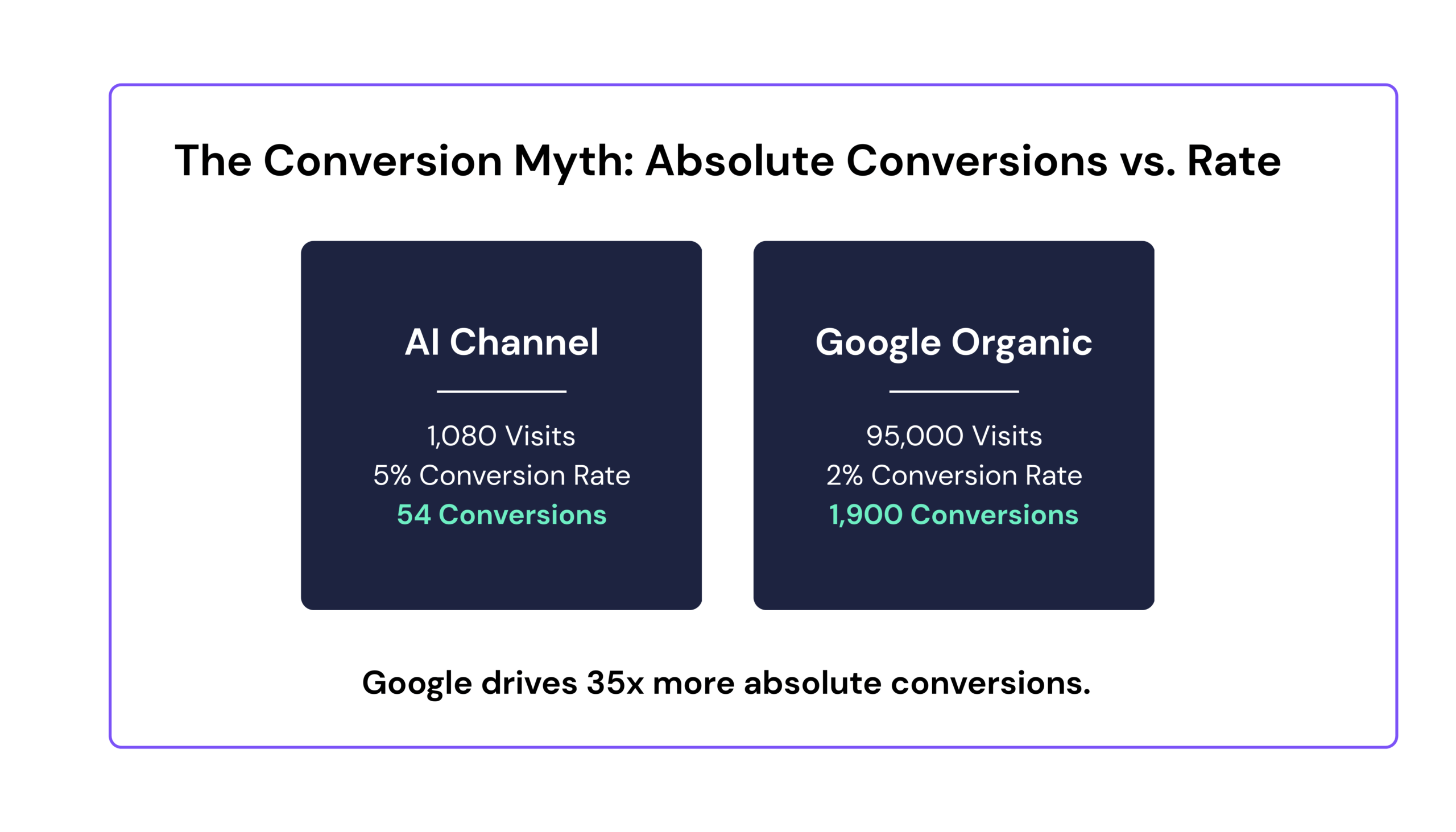 Even with a conversion rate 2.5x higher (which may or may not be actually true or widely representative), the sheer dominance of Google means it drives 35 times more absolute conversions than the AI channel. This is literally the best (hypothetical-yet-unprovable) case.