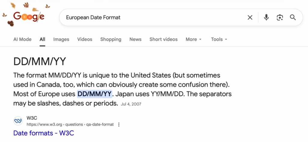 Look up at the Ahrefs example above, where one of the ranking keywords last summer was for “European Date Format.” Now, let’s Google that query to see what we see:
