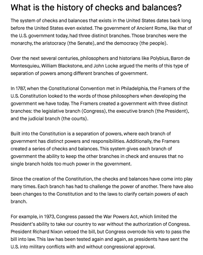 Even if you knew what “checks and balances” were going into this, you undoubtedly just learned something about its evolution and context and now possess a greater understanding of the subject before you started reading.