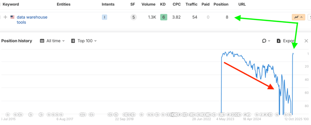 Until it doesn’t, losing all of the positions and traffic it just gained. We literally just did a Traffic Recovery mission for a client, resurrecting an important keyword for a client in less than one month of republishing.
