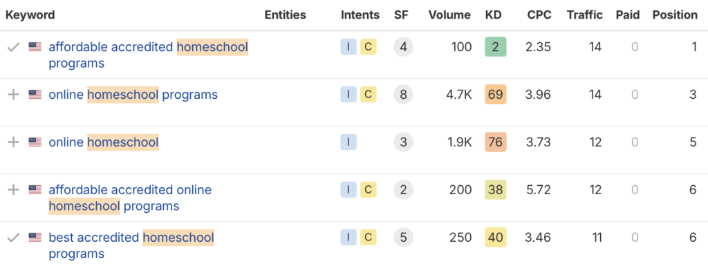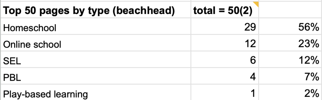 The table below shows that 56% of “homeschool” pages we produced are hitting the first page. That’s, well, awesome.