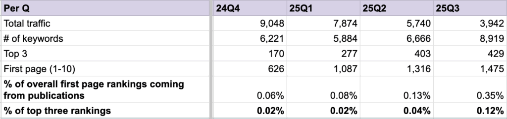 Now, look at how total traffic has declined pretty steadily. Yet, the number of top three ranking positions and first page results has grown substantially.