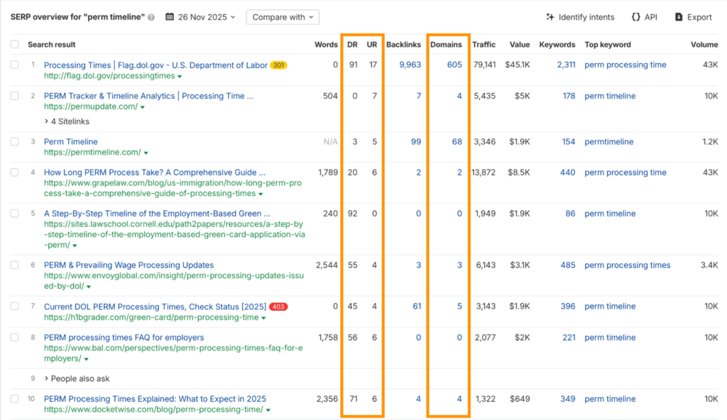 For instance, if you were trying to target a keyword like “perm timeline,” what is the range of brand site strength in the top ten (DR & UR), and also the number of unique referring domains to each individual page that you might have to compete with?