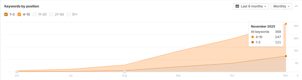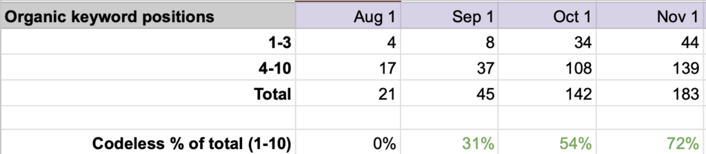 What you’re seeing here is the cumulative growth of first-page ranking positions on the first 50 articles for a brand new site. Again, you can and should show this compounding nature over time, like this:
