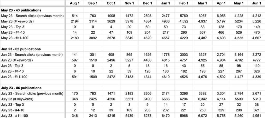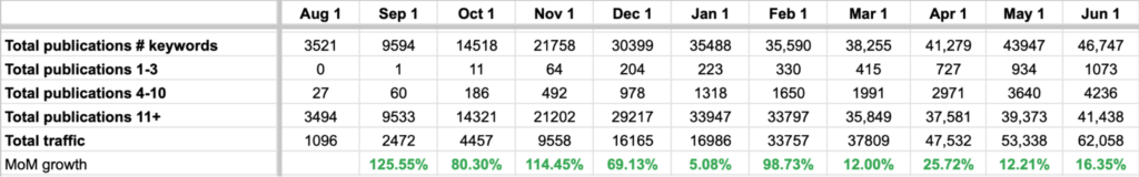 In the example table below, we can see how a client’s traffic grew from 1096 monthly visits to over 62,058 each month from just our content publications: