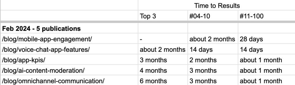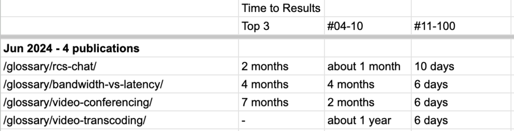 For example, check out the performance of these URLs by how long it ACTUALLY took to reach top three or first page: