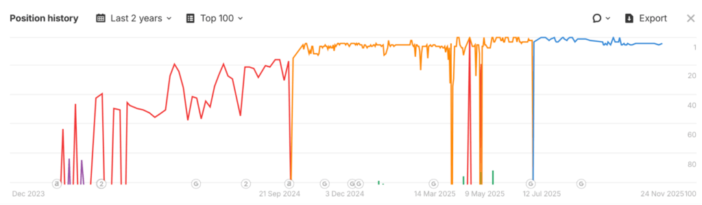 Read Traffic Recovery for more here. But long story short, a traffic loss due to a top ranking position lost (ex. 1 → 7) on content that hasn’t been updated in two+ years should be recovered immediately. Especially when you can tell that the content type will continue to work well for LLMs discovery, too.