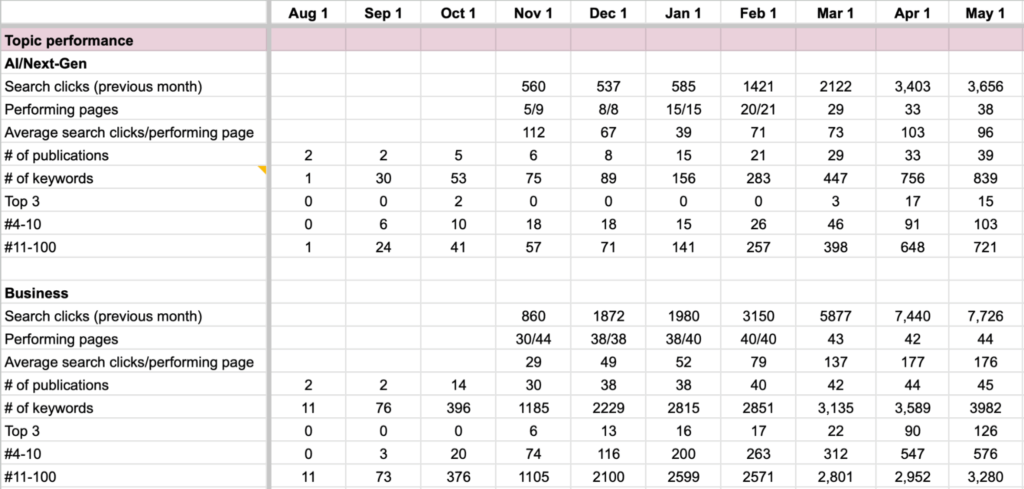 Like this example below, that shows the ranking positions and clicks by pages relating to either “AI”-based topics vs. “business”-focused ones: